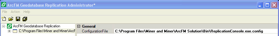 - To Create a new configuration file, right-click the ArcFM Geodatabase Replication node and select New Configuration File. Select the configuration node. The ConfigurationFile field to the right establishes the name and location of your configuration file. Browse to the location in which your configuration file should be stored (see Step 2). Name the file ReplicationConsole.exe.config and click Save.