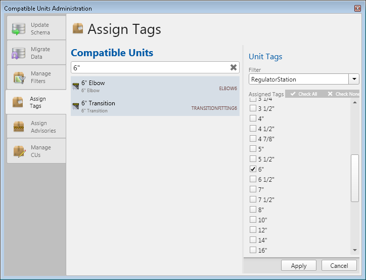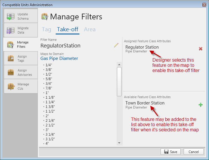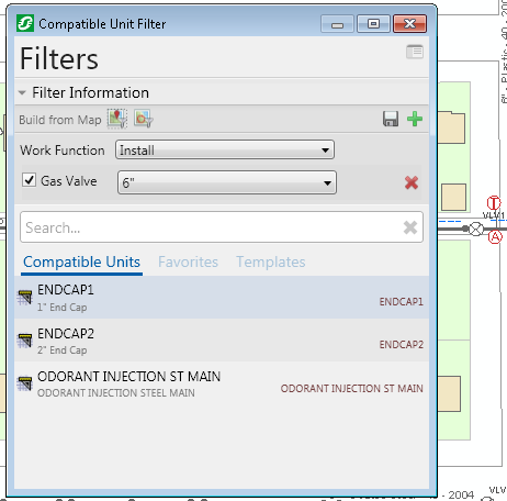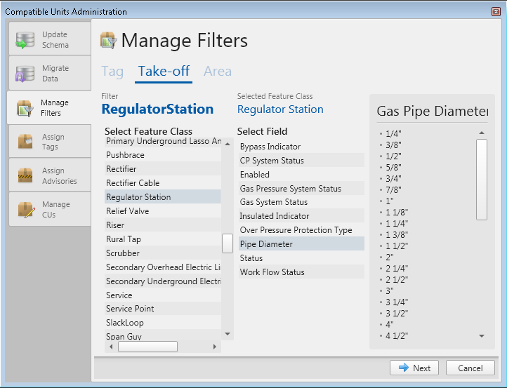 As an example in this section, we're going to create a take-off filter that enables when the user selects a Regulator Station or a Town Border Station and filters the available CUs based on the Pipe Diameter field.