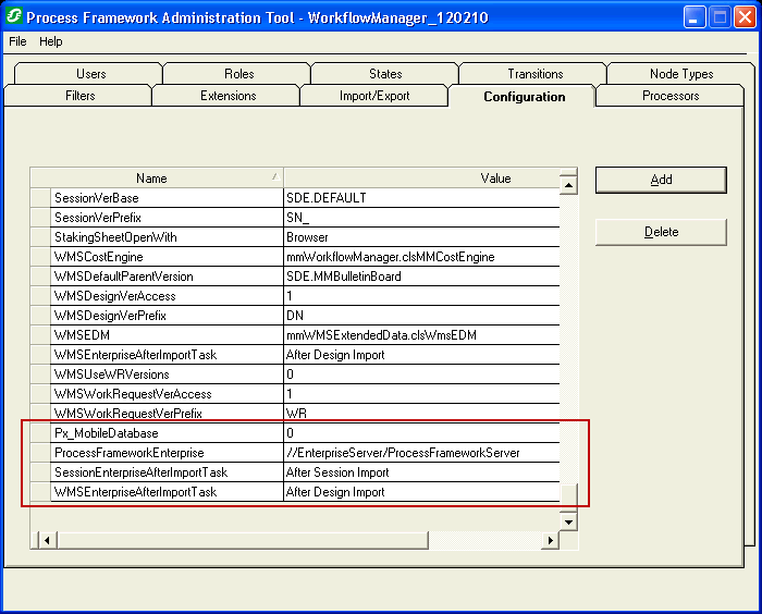 - Px_MobileDatabase Optional. If you don't add this configuration to the enterprise process framework database, it will still work. Note that the value is '0' to indicate the enterprise geodatabase.