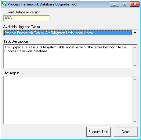 Select the task you wish to perform and click Execute Task. The Messages window lists the upgrades that were performed and whether they were successful. Click Close to dismiss the tool. Once executed, the tasks may not be reversed.