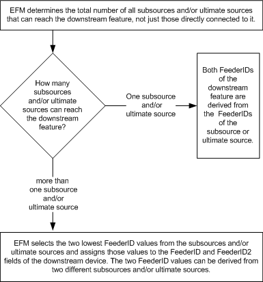 The flow chart below describes the logic Feeder Manager and EFM use when assigning values to the FeederID and FeederID2 fields in a feature downstream from subsources and/or ultimate sources