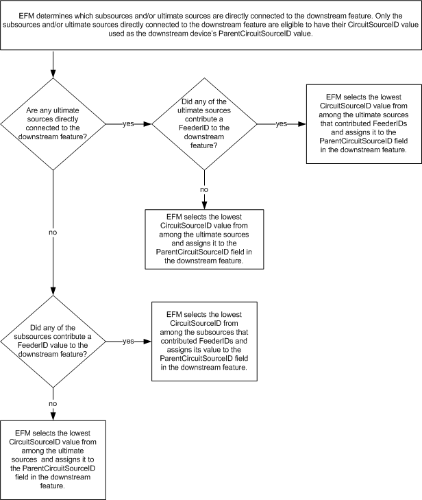 The flow chart below describes the logic EFM uses when assigning a value to the ParentCircuitSourceID field in a feature downstream from subsources and/or ultimate sources.