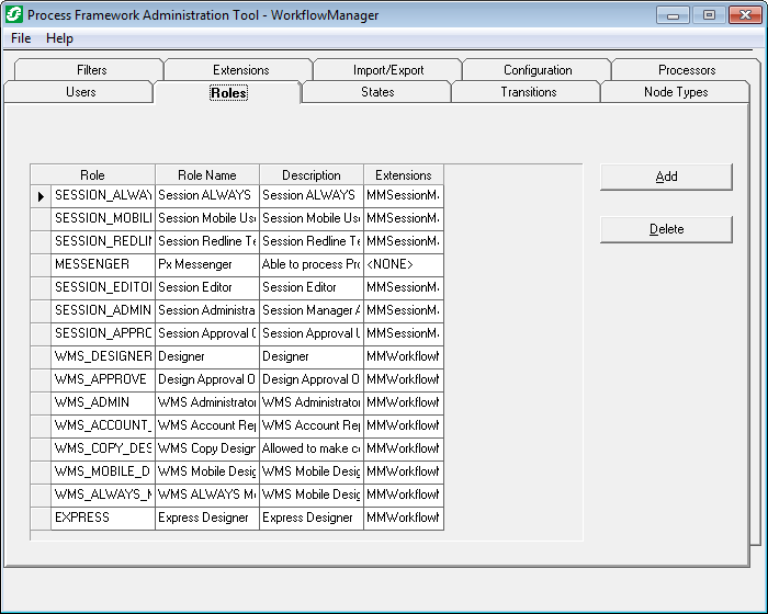 Create roles that can be assigned to users, states, transitions, and filters on the Roles tab. A role assigned to a user determines who has permission to perform modifications to a node's internal state or transition a node to a new state. A Role assigned to a state, transition, or filter indicates the role a user must have to edit the state, perform the transition, or utilize the filter.