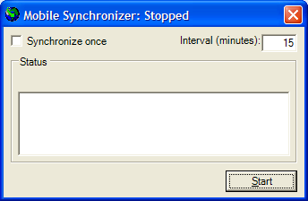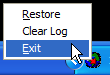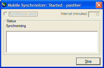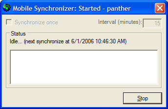 To exit the Mobile Synchronizer application, you must first click the Stop button on the application. Then, right-click the icon in the task bar and select Exit. The Exit option will remain disabled as long as the Synchronizer application is running. Right-click and select Restore or double-click the icon to open the Mobile Synchronizer window. Select Clear Log to clear the error messages from the Status window.