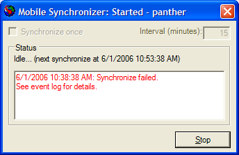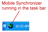 Should the Mobile Synchronizer fail to execute the Send/Receive Mobile Data task, a message in the Status field will alert the user to the failure. The icon in the task tray will turn red