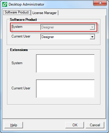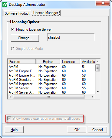 If you're running License Manager on a machine with a Windows 7 operating system, you may have trouble accessing the options necessary to control system-level licensing in the Desktop Administrator. In this case, the System field on the Software Product tab is disabled (figure 1). On the License Manager tab, the "Show license expiration warnings to all users" checkbox is disabled (figure 2).