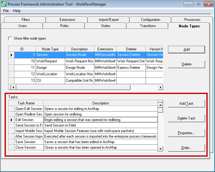 Renaming Tasks: You can rename existing tasks (i.e., those provided with the product). However, renamed tasks MUST be localized. In many cases buttons and subtasks may refer to tasks by name. If you do not localize a renamed task, any buttons or subtasks that reference it will fail. Refer to the Process Framework Tasks Localization page on the ArcFM Solution Resource Center. |