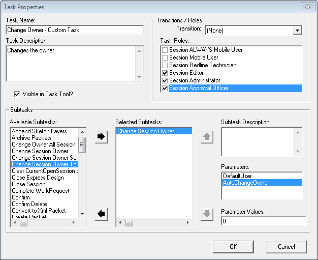 Tasks allow users to divide actions performed by a tool (such as Submit) into subtasks and execute these subtasks as a group. For example, the Submit tool changes the node's state to Pending Approval and changes ownership of the node to an Approval Officer. Tasks divide the Submit tool into two subtasks (change state and change owner). You may then use these subtasks in conjunction with other subtasks to create a task that best accommodates your business process.