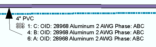When Conductor Information is configured correctly, the user may display information from the Conductor Information table in the annotation contents list. In the example below, the contents list displays the material for each phase of the conductor. Refer to the Configure Annotation Options page for more information about setting up annotation to display Conductor Information data.
