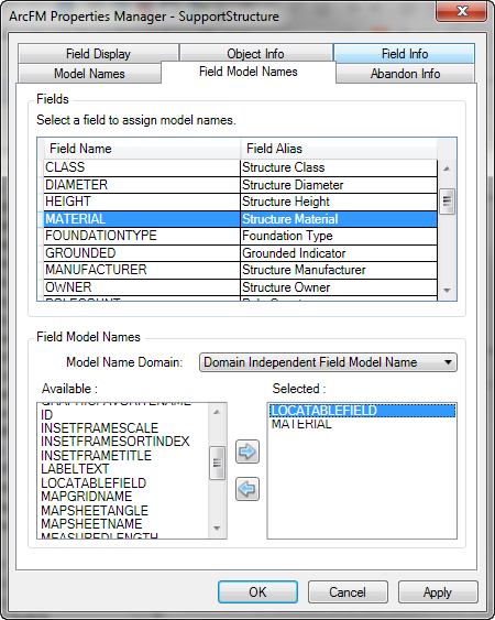 2. Assign the LOCATABLEFIELD field model name from the Domain Independent Field Model Name domain. Assign this field model name to all attribute fields you wish to appear on the Object Query Locator.