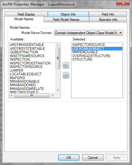 2. On the Model Names tab, assign the LOCATABLEOBJECT model name from the Domain Independent Object Class Model Name domain.