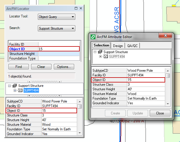 In the example below, the user performed a search for a support structure with an Object ID of 15. The Object ID field in the attribute section of the Ojbect Query Locator confirms that the search resulted in a support structure with an Object ID of 15. You can also use the Quick Attribute Viewer.