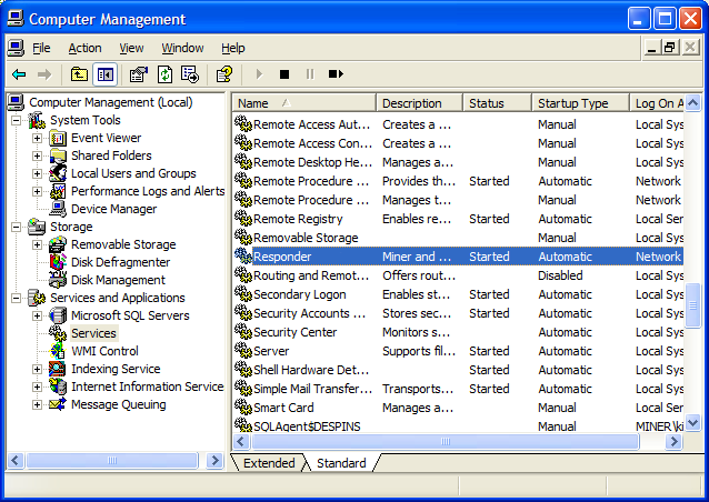 A specific login name is used when executing the Responder Windows Service. This login name used to execute the Responder Windows Service is determined in the Computer Management window (steps shown below). This login defaults to the user you specify while installing Responder server. However, you may change it using the steps below.