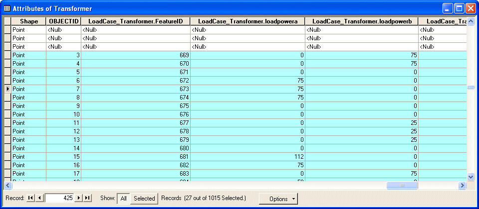 The fields in the LoadCase_Transformer table are visible if you right click the Transformer layer and select Open Attribute Table. Scroll to the end of the fields to view the LoadCase fields. The records highlighted in blue are currently selected on the map.