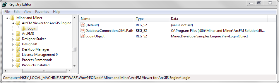 Implement Your Custom Login Object on a 64-Bit MachineIf you're implementing a custom login object on a 64-bit machine, the process is slightly different. Open the registry and browse to the following location: HKEY_LOCAL_MACHINE\SOFTWARE\Wow6432Node\Miner and Miner\ArcFM8\ArcFMLogin. At this location create a registry key with a data type of Text and name it "LoginObject". Modify the value of this key to be the progID of your custom login object. Alternately, you can use a script (*.reg file) to create and install this registry key. In the sample script below "CustomLoginObject.CAFMLogin" is the progID of the login object.